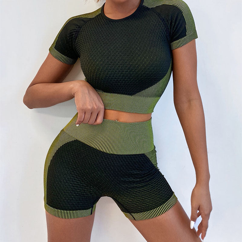 New Amazon Quick-Drying Yoga Suit Running Sports Short Sleeve Two-piece Set High Waist Seamless Fitness Shorts Women